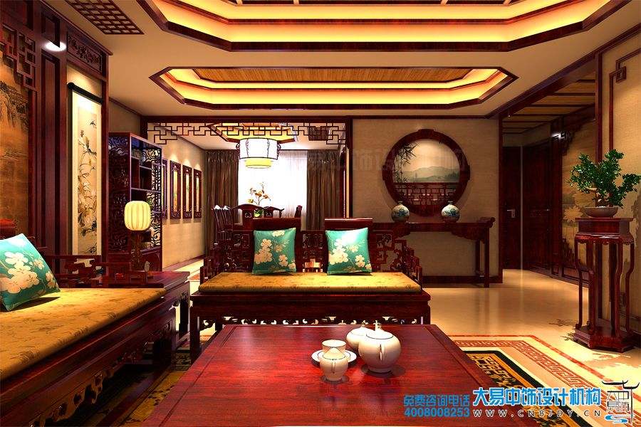 客廳設計雖然擺放了大量的中式家具,可溫暖的色調與創意的設計成了柔化室內空間生硬的線條,賦予居室一種典雅舒適的格調