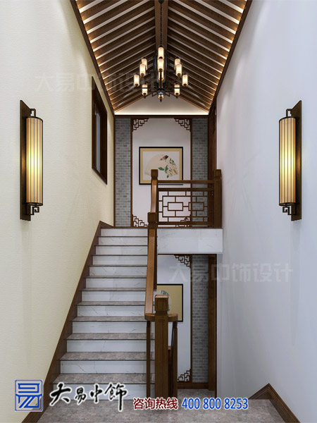 人字欄讓樓層之間的距離顯得更高,空間因而變得寬闊許多。灰色地磚和木欄扶手的搭配,又是中式別墅中最為古樸的裝飾。