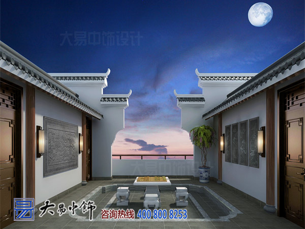 此處設置下沉式石桌石凳,馬頭墻立面設計感十足。可在此觀星辰,賞月光,在冬季的時候看雪景,曬太陽,妙哉!
