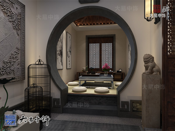 進(jìn)門處的玄關(guān)正面設(shè)計(jì)了磚雕的影壁墻作為裝飾,下面配上雕刻的荷花石槽,給人清新淡雅古韻幽香的美感。頂面采用傳統(tǒng)的帶有徽派及江南水鄉(xiāng)韻味的四水歸名堂的設(shè)計(jì)。整體打造出了室內(nèi)庭院的景觀,仿佛使人置身于江南小院。