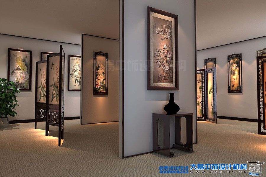 中式書畫展廳傳承中式傳統(tǒng)的精髓,尤其是字畫展覽,呈對稱方式分布,看起來美觀整齊大方