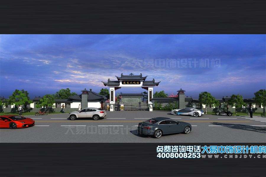 大門設(shè)計,采取了中式傳統(tǒng)建筑模式,突顯大氣、恢弘、莊雅的氛圍。