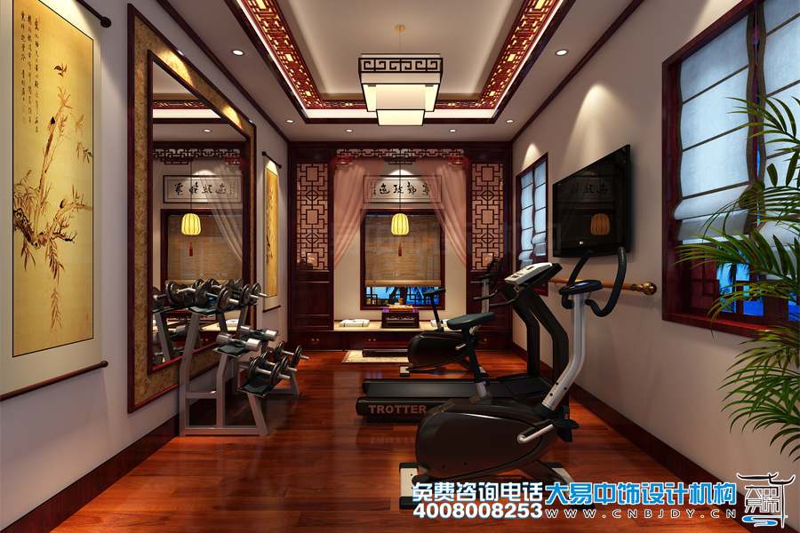 一樓中式健身房非常干凈,擺放的幾處健身器材,很有動(dòng)感