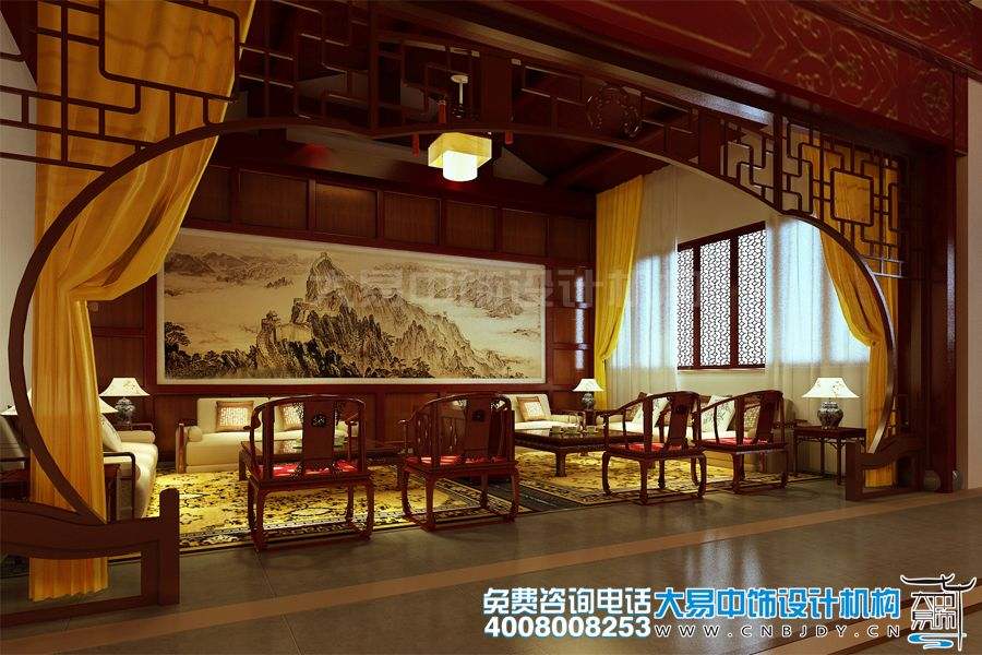 會客廳中式設計裝修,與餐廳用木欄相隔,在此隔斷不拘于傳統的圓形,以曲線之美更顯柔和。此外以紗帳為飾,相得益彰。