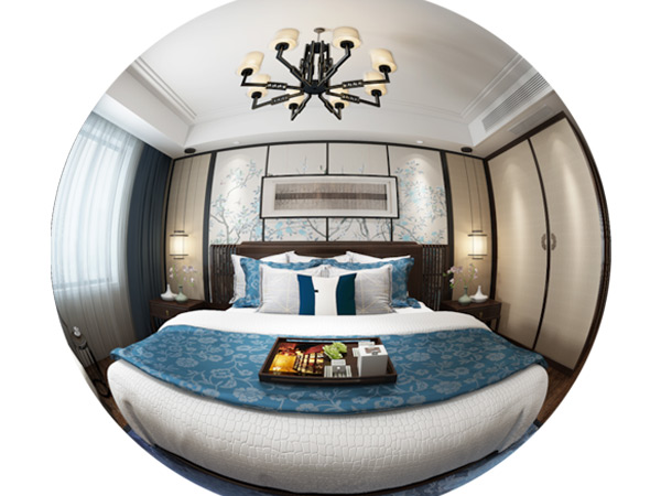 現代中式設計天藍色臥室裝修全景VR效果圖