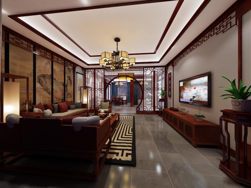 大易中飾負責設計一款四合院裝修客餐廳的中式設計,主要是以實木家具為主,紅色調設計。