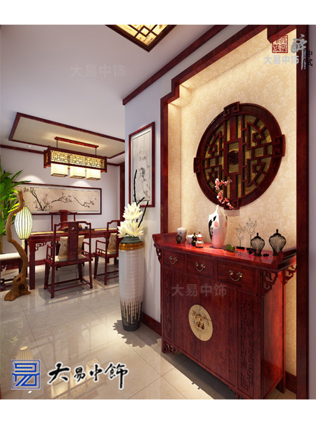 戶型進(jìn)門處做了改動(dòng),增加了一個(gè)步入式衣帽間,便于日常生活使用.衣帽間側(cè)墻開一圓形景窗設(shè)置小條案,形成玄關(guān)背景.保證私密的同時(shí)又有很好的中式裝飾效果。
