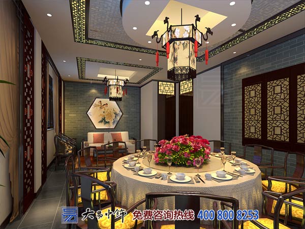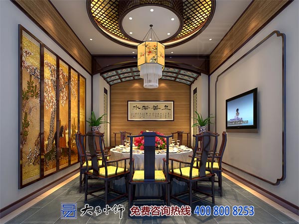 在新中式飯店設計的時候可以營造柔、高雅氛圍的飯店裝修效果,比如在中式風格飯店裝修時,可以選擇采用隱喻的手法把,一些具有中國特色元素的窗格、燈籠、水墨畫等等融入到飯店設計,在這樣的設計中做吊頂設計時,可以采用四方形的窗格吊頂,就能夠與圓形的餐桌相結合也就表達出了"天圓地方"的構想。