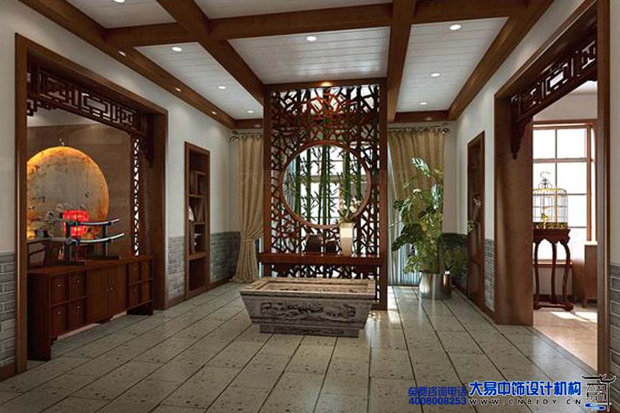 進門玄關氛圍古色古香,鏤空的實木隔斷,更彰顯了業主高端的生活品味